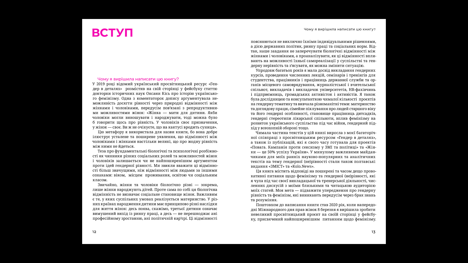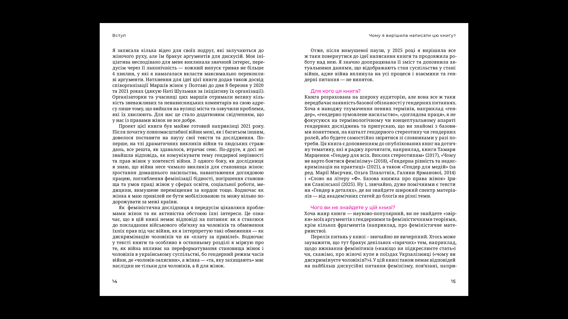Ця книжка виросла з багаторічної викладацької, дослідницької та просвітницької роботи авторки та з живих дискусій про фемінізм, які точаться в українському суспільстві. Вона починається з простого, але впертого аргументу про «природні відмінності» й послідовно показує, як саме соціальні правила, економічні умови та державні рішення перетворюють ці відмінності на нерівні можливості. У центрі — український досвід, з урахуванням викликів повномасштабної війни та її впливу на становище жінок і чоловіків.